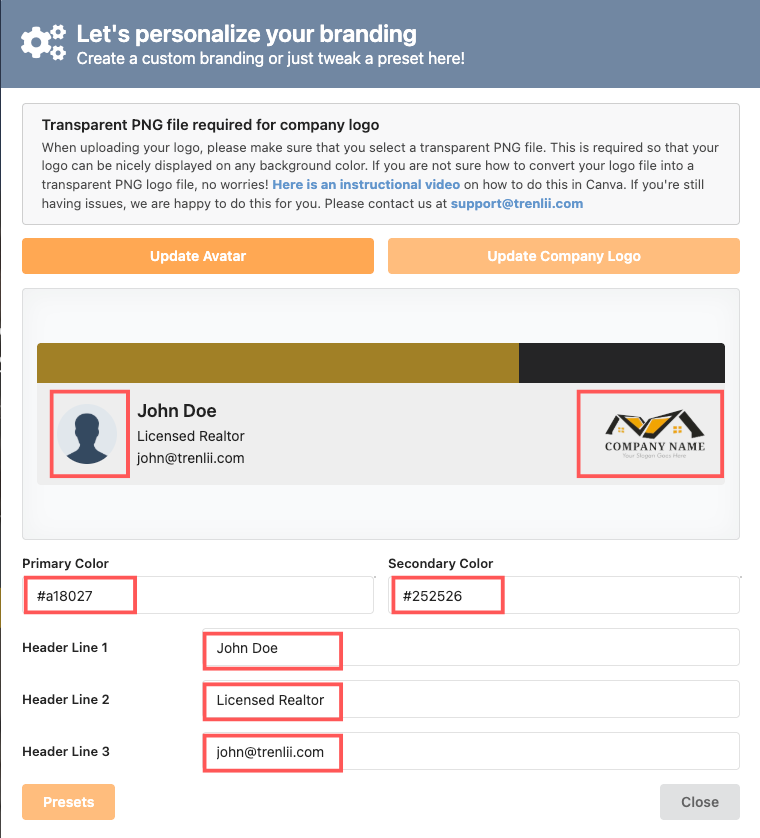 When you click one of these areas, a branding editor modal will appear — this is where you’ll make your updates.